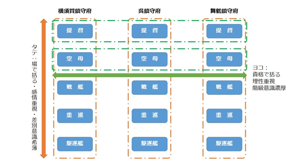 ///一方、場(組織や所属)を重視するのが日本。さまざまな資格を持つ者たちが場によって一括りにされてしまう。そのなかでは一体感が尊ばれ、否が応にも場に対する忠誠度も高まっちゃう。資格による区別が希薄だから、能力よりも在籍年次の長いひとのほうが優遇されがち。理屈より情が幅をきかす親分子分の世界でもあります。着任したてのころは「みなさん、はじめまして、このたび着任しました新米提督どぇーっす! 暁サン、今日もレディーですね! 加賀さん、そんなものこの提督めがお持ちしますですっ! 那珂ちゃん、センターよろしくっ! 呉鎮守府や舞鶴鎮守府の成績が若干上回っているようなので、みんな一丸となって頑張りましょーっ!」ってな具合ですが、ひとたび戦闘ともなれば娘たちが「提督に指一本触れさせてなるものか! 皇国ノ興廃此ノ一戦ニ在リ、各員一層奮励努力セヨ!」と早変わり。これが日本でよく見かける組織の姿なんですね~♪